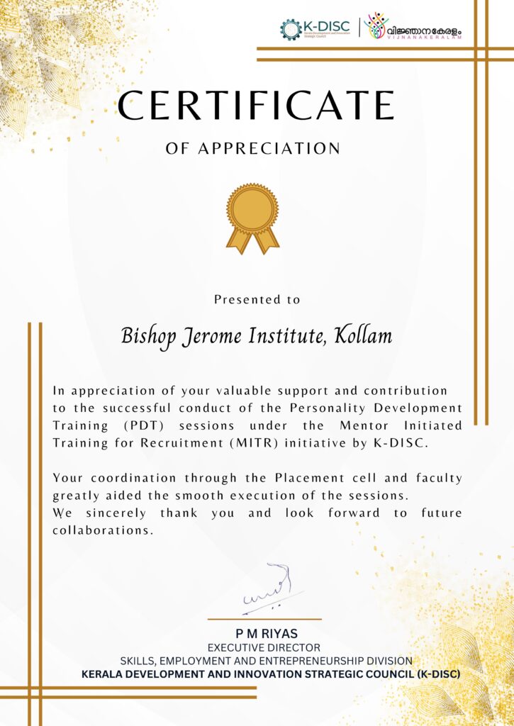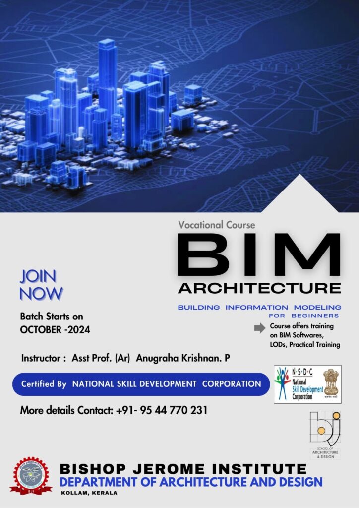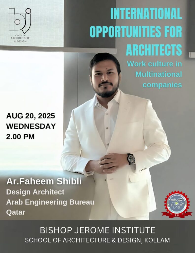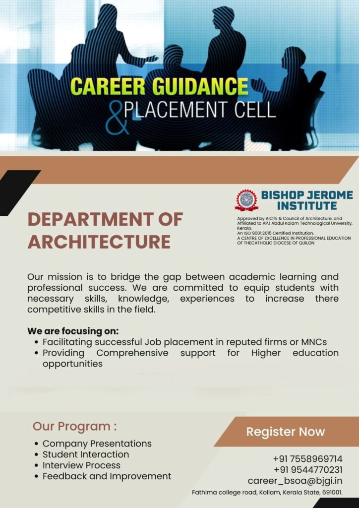 The Department of Architecture, Bishop Jerome Institute, Kollam, announces the launch of the Career Guidance and Placement Cell (CGPC). The CGPC aims to assist students with career placements through campus recruitment and also support students who are intended in pursuing higher education.