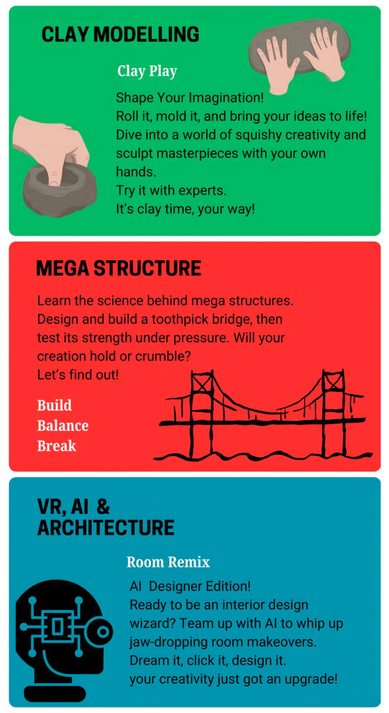 These workshops aim to Cultivate innovation, Foster creativity, and provide students with a glimpse into the future of design and technology. This event is an excellent platform to ignite a passion for architecture, design, and technology among aspiring creative young minds. Participation is free and seats are limited to maintain the quality of the workshops.