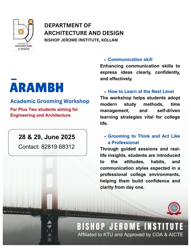 Bishop Jerome Institute proudly announces ĀRAMBH – an exclusive pre-college grooming workshop for selected Plus two students aspiring for career in Engineering &Architecture.