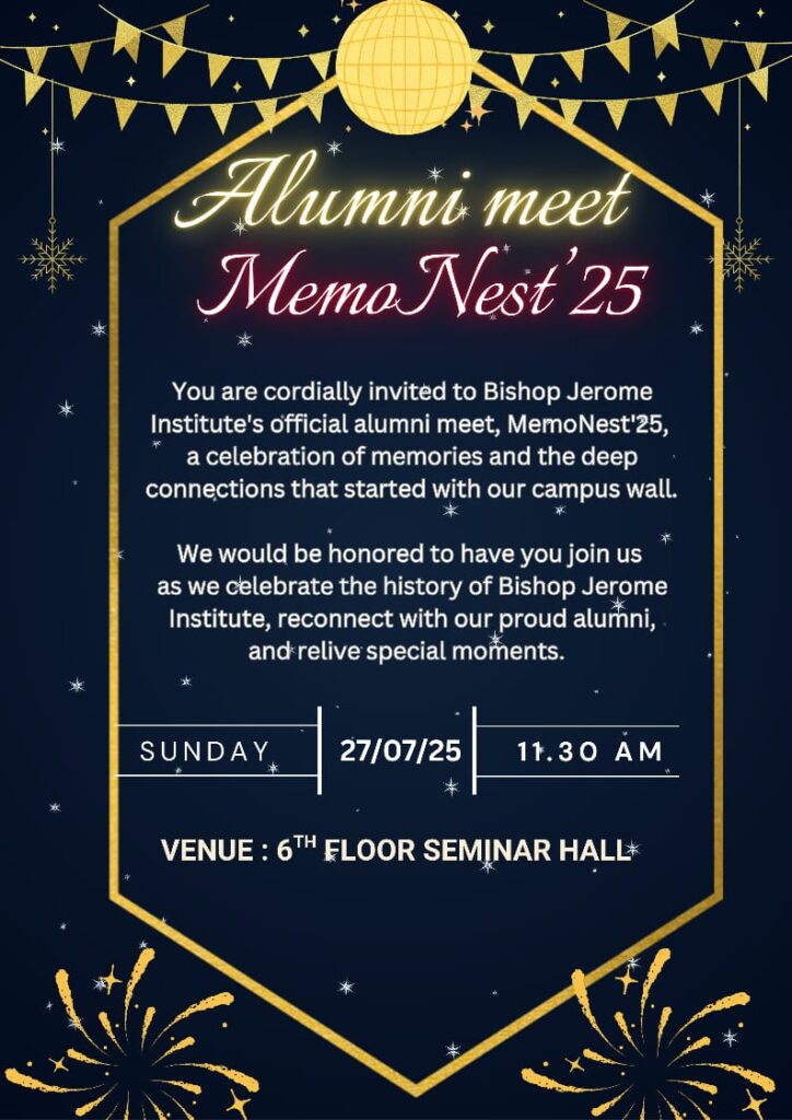 The Alumni Meet 2025 of Bishop Jerome Institute will be held on 27th July 2025 at the campus