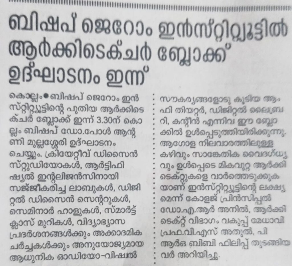 കൊല്ലം ബിഷപ്പ് ജെറോം ഇൻസ്റ്റിറ്റ്യൂട്ടിലെ പുതിയ ആർക്കിടെക്ചർ ബ്ലോക്ക് ഈ മാസം 3-ാം തീയതി കൊല്ലം ബിഷപ്പ് ഡോ. പോൾ ആന്റണി മുല്ലശ്ശേരി ഔപചാരികമായി ഉദ്ഘാടനം ചെയ്യും.