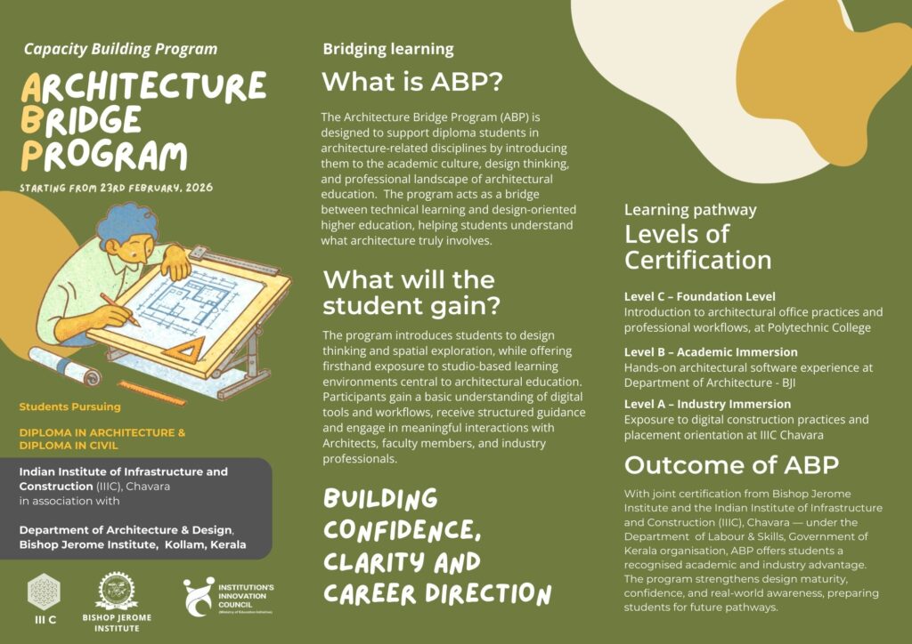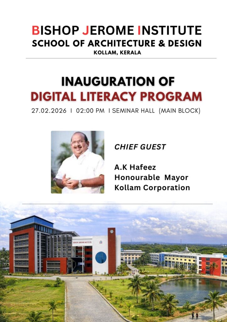 Bishop Jerome Institute- Architecture and Design, f is a premier institution dedicated to nurturing future architects, located in Kollam, Kerala State. The institution offers Five year full time B.Arch course and is affiliated to APJ Abdul Kalam Technological University and Approved by Council of Architecture, under Ministry of Education, Government of India.